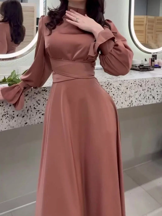 Sheyla - Fashionable plain linen and cotton V-neck dress
